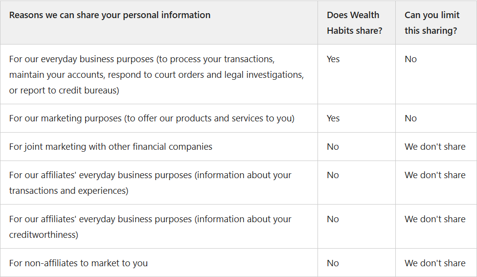 All financial companies need to share clients' personal information to run their everyday business. The table below lists the reasons we share, whether Wealth Habits chooses to share, and whether you can limit this sharing.